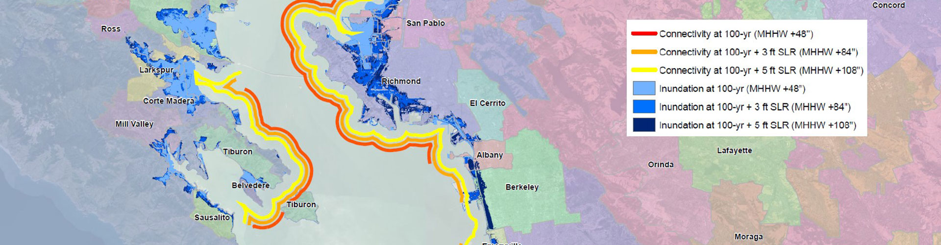 Inundation extents are based on mapping conducted for the Bay Conservation and Development Commission’s Adapting to Rising Tides project (BCDC, 2017). Different color lines show connectivity for each flood scenario, with the red line signifying immediate need for coordination between jurisdictions due to present 100-yr flood hazards, and orange and yellow lines suggesting coordination needed in current planning activities to prepare for future conditions.